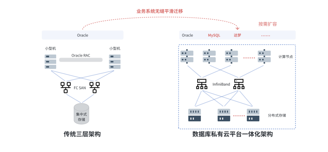 后来,该平台将继续承载各种管理类系统,如内控等系统,并将部署Oracle、MySQL、达梦等类型数据库,实现资源动态按需灵活扩容,满足不同业务需求。并将原有运行在小型机+集中存储上的数据库业务无缝平滑迁移到纯X86服务器架构的云端环境。在保证数据库性能、扩展性优于原有架构的前提下,提供稳定可靠的运行环境,降低总拥有成本(TCO),并与云化环境无缝结合。