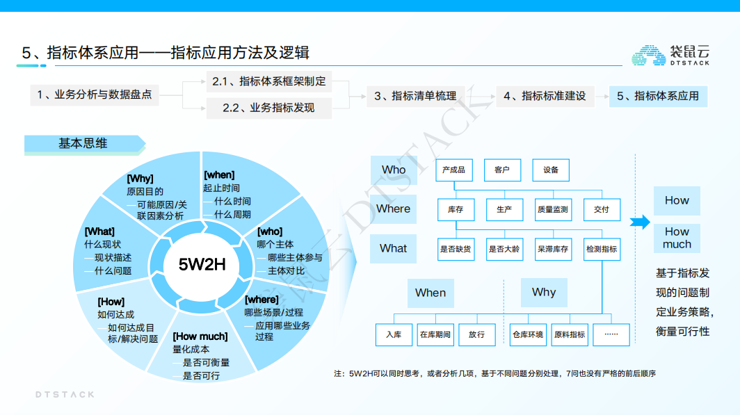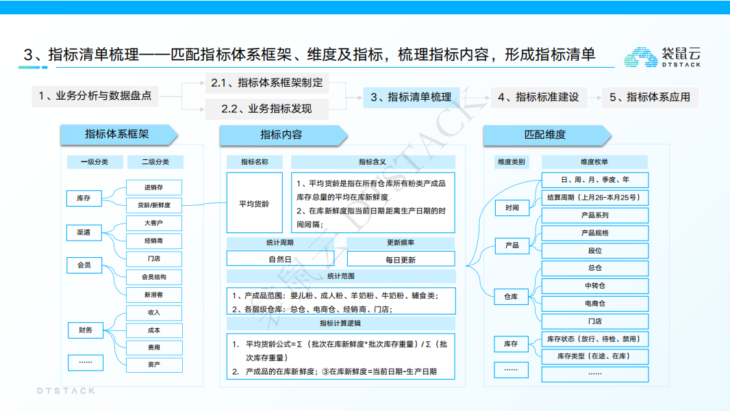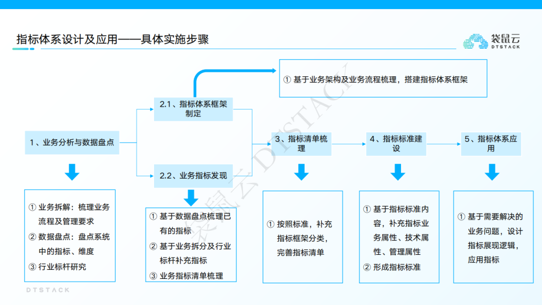 指标体系设计我们可以依循从业务分析与数据盘点、指标体系框架制定、业务指标发现、指标清单梳理、指标标准建、指标体系应用等步骤展开。