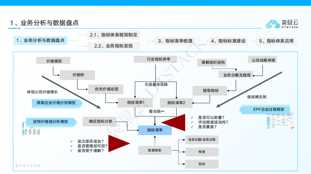 数据盘点:盘点现有系统中的指标和维度,识别数据的质量、完整性,为后续设计奠定基础。