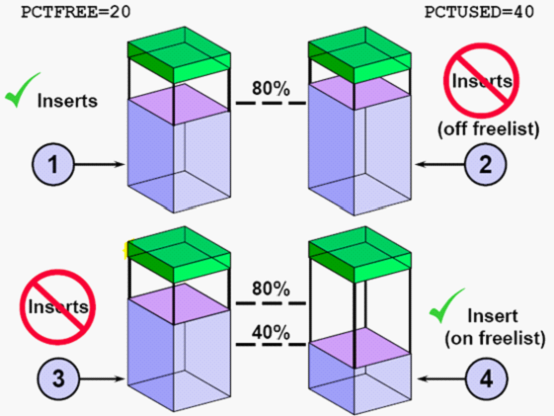 块头(数据块的头)不在百分比的范围内,当剩余空间大于20%的时候,那这个块就是纳入freelist中,当我要插入一条数据时,freelist是会扫描这个块的,检查其它是否可以存放要插入的数据。当小于20%的这间时,说明这个块已经满了,会从freelist中去掉,插入数据时不作为扫描的对象。