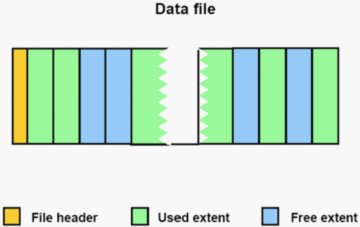 一个数据文件有一个文件头,点用了若干个数据块,这这个文件头里记录着盘区的分配与释放的信息。在这个文件中有些盘区是被使用的,有些盘区是空闲的。