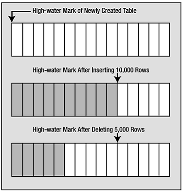 对一一个新建立的表,表中包含很多数据块,water mark 原始指向表中的第一个数据块。