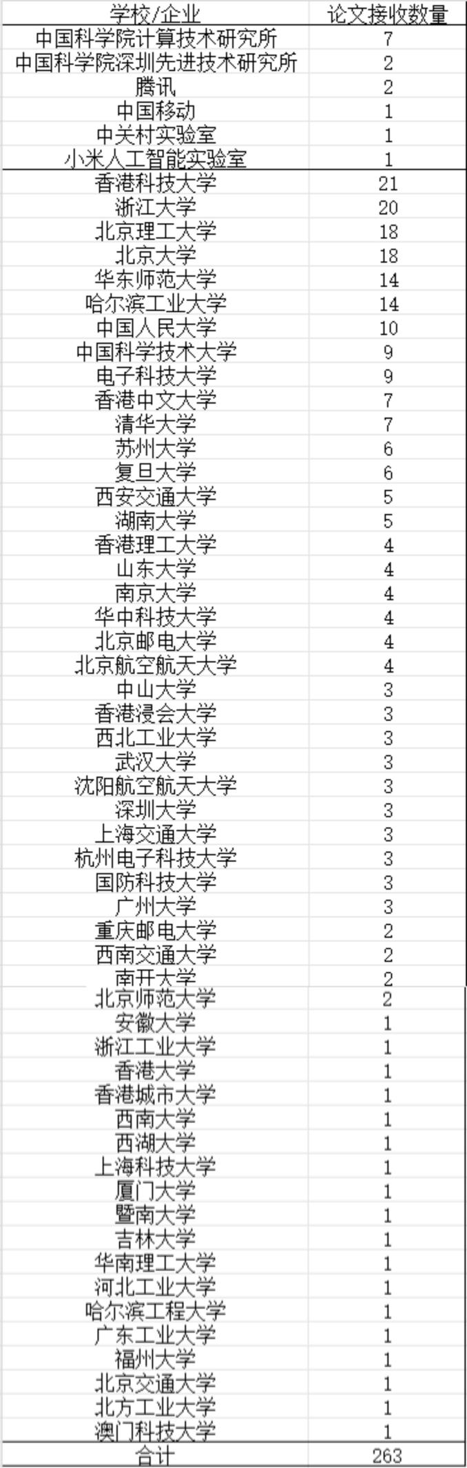 本次会议共接收论文377篇,其中以第一作者单位为中国高校发表的文章共有263篇。下表展示了ICDE 2024 会议中国各高校所接收论文的详细情况(按论文接收数量排序)。