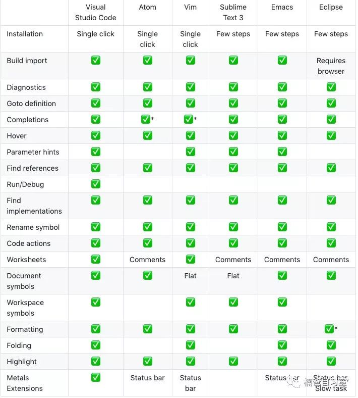 我曾经尝试过Ensime, 体验并不是很好,现在它已经被Metals替代了,下图就是Metals目前支持的编辑器