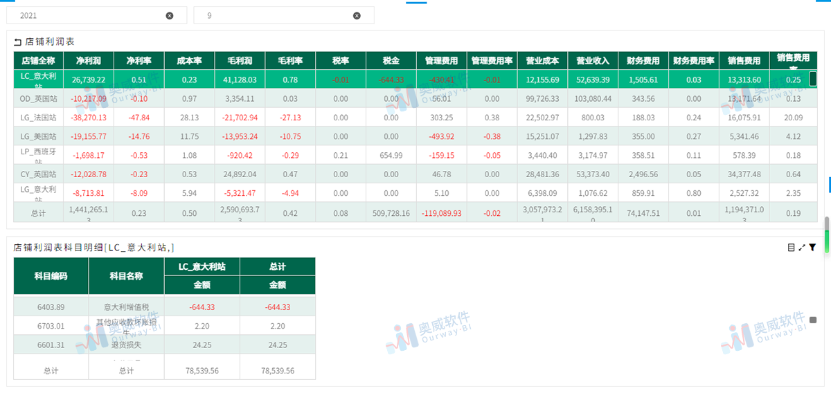 哪家店铺的利润更高?XX店铺的利润表科目明细是什么情况?2024年3月意大利站店铺的毛利润是多少、净利润多少?……当你有多家店铺,需要更快地了解利润情况时,可以像下图这样,制作一张BI数据可视化分析报表。用BI数据可视化打开电商利润表,更高效、也更直观。