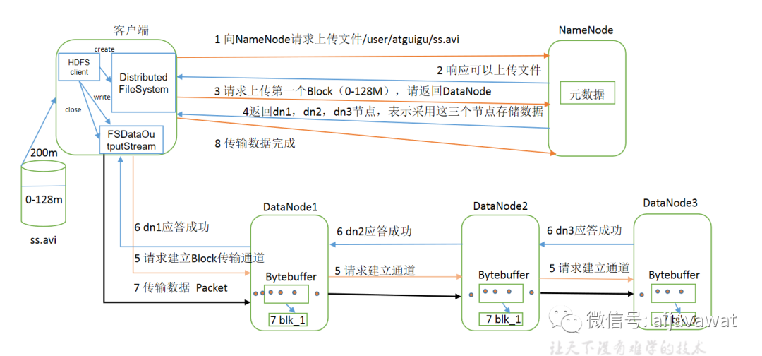 客户端开始往 dn1 上传第一个 Block(先从磁盘读取数据放到一个本地内存缓存), 以 Packet 为单位,dn1 收到一个 Packet 就会传给 dn2,dn2 传给 dn3;dn1 每传一个 packet 会放入一个应答队列等待应答。