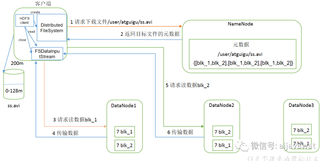 客户端通过 DistributedFileSystem 向 NameNode 请求下载文件,NameNode 通过查 询元数据,找到文件块所在的 DataNode 地址。