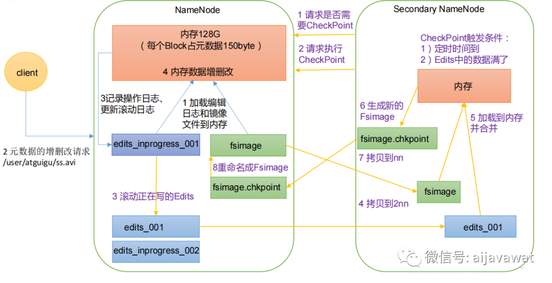 Secondary NameNode 加载编辑日志和镜像文件到内存,并合并。