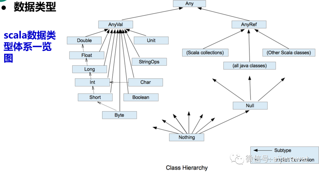 Scala数据类型分为两大类 AnyVal(值类型) 和 AnyRef(引用类型), 注意:不管是AnyVal还是AnyRef 都是对象。
