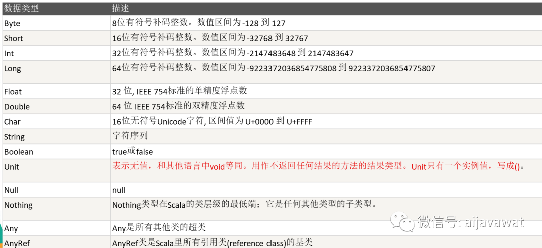 Scala 与 Java有着相同的数据类型,在Scala中数据类型都是对象,也就是说scala没有java中的原生(基本)类型