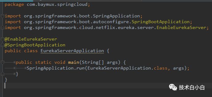 package com.baymux.springcloud;import org.springframework.boot.SpringApplication;import org.springframework.boot.autoconfigure.SpringBootApplication;import org.springframework.cloud.netflix.eureka.server.EnableEurekaServer;@EnableEurekaServer@SpringBootApplicationpublic class EurekaServerApplication { public static void main(String[] args) { SpringApplication.run(EurekaServerApplication.class, args); } }