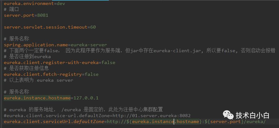 eureka.environment=dev # 端口 server.port=8081 server.servlet.session.timeout=60 # 服务名称 spring.application.name=eureka-server # 下面两个一定要false, 因为此程序要作为服务端,但jar中存在eureka-client.jar, 所以要false, 否则启动会报错 # 是否注册到eureka eureka.client.register-with-eureka=false # 是否获取注册信息 eureka.client.fetch-registry=false # 以上表明为 eureka server # 服务名称 eureka.instance.hostname=127.0.0.1 # eureka 的服务地址, /eureka 是固定的,此处为注册中心集群配置 #eureka.client.service-url.defaultZone=http://01.server.eureka:8082 eureka.client.serviceUrl.defaultZone=http://${eureka.instance.hostname}:${server.port}/eureka/