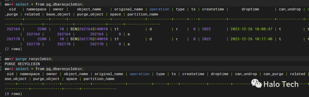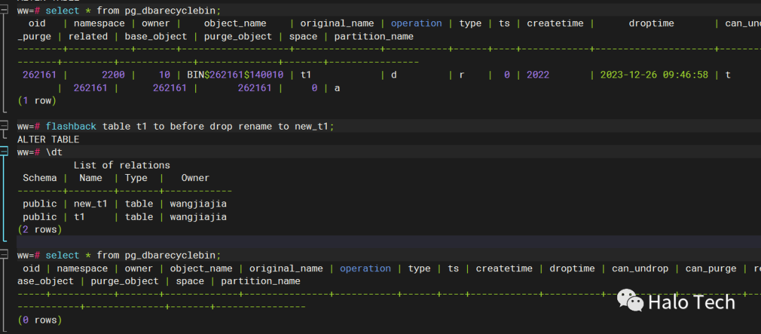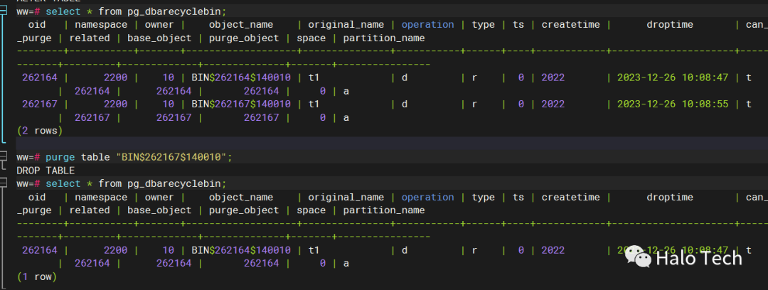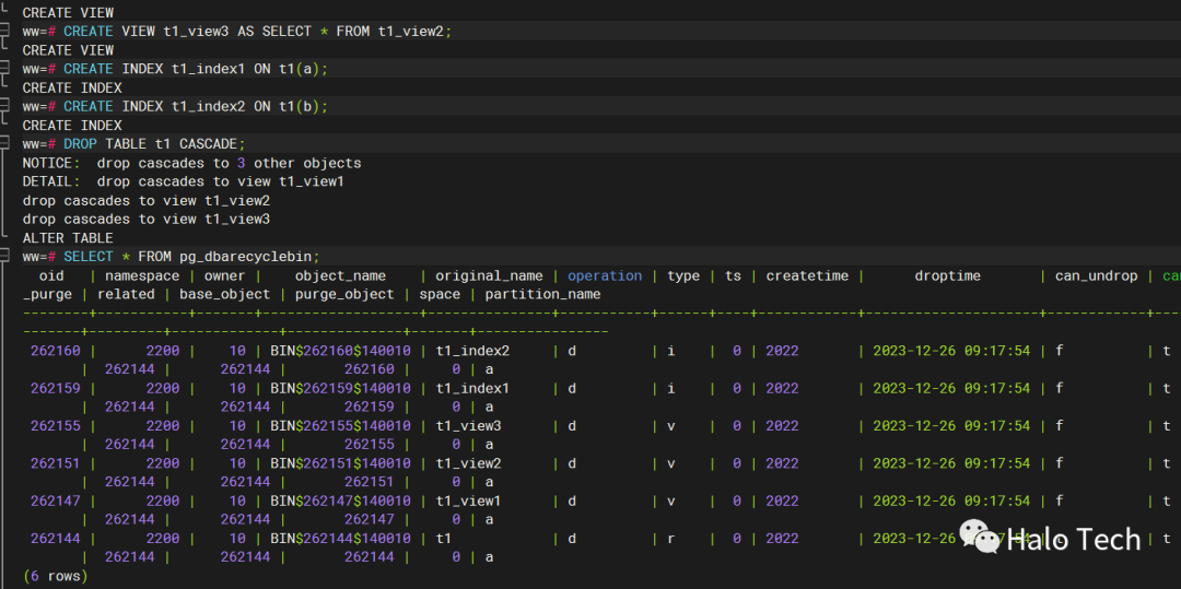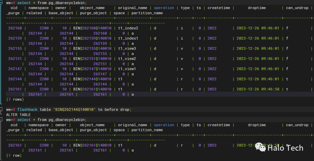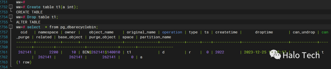 由输出可以看出,表t1已经记录在回收站中。记录该表所属schema为public,所属用户为10,并记录了删除时间为2023-12-25 17:42:17,此时自动生成了一个被删除表的系统名称为BIN$262141$140010,该名称由bin$和表oid及版本号组成。