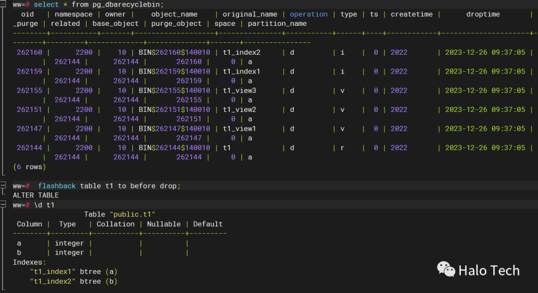 同样的,闪回回收站中的表,该表的依赖对象,如涉及的索引、视图函数等也会一起回收。回收命令: