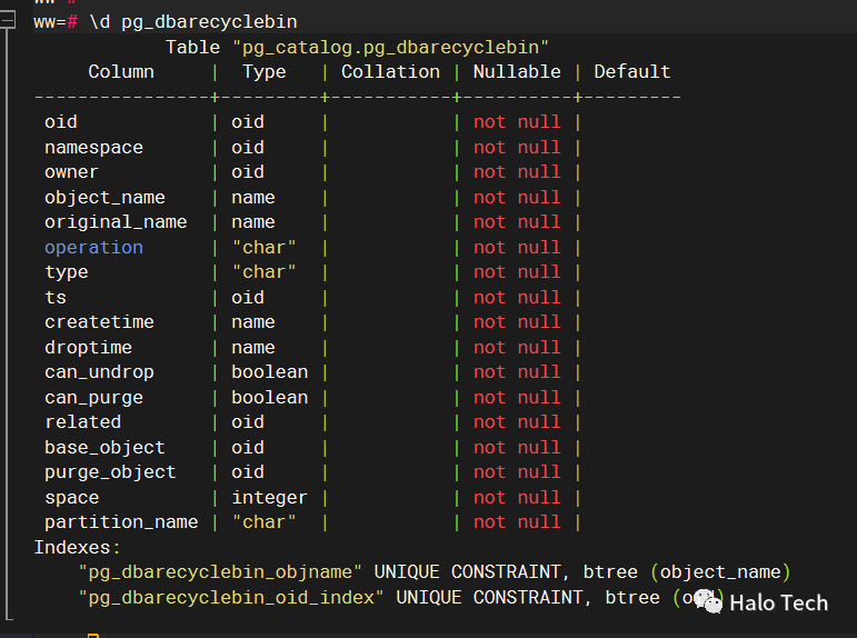 接下来我们先看一下系统表pg_dbarecyclebin的结构: