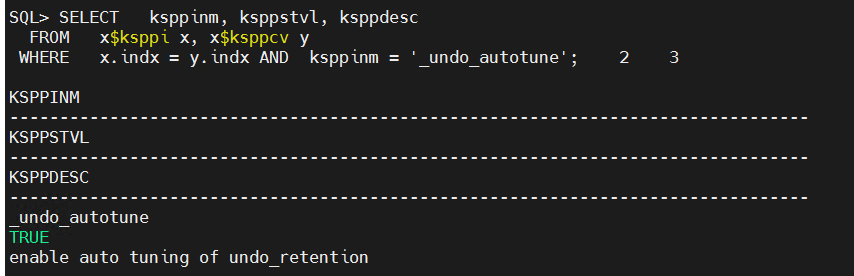 SELECT ksppinm, ksppstvl, ksppdescFROM x$ksppi x, x$ksppcv yWHERE x.indx = y.indx AND ksppinm = '_undo_autotune';