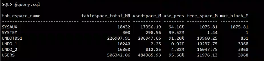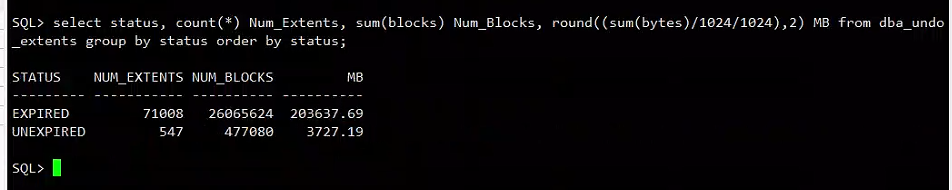 select status, count(*) Num_Extents, sum(blocks) Num_Blocks, round((sum(bytes)/1024/1024),2) MBfrom dba_undo_extentsgroup by status order by status;