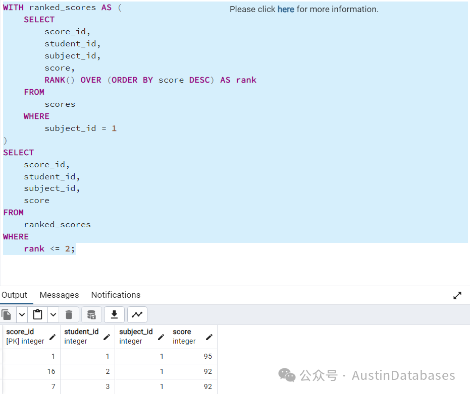 在获得最低英语成绩的两个学生的ID后,在通过mathscoresforlowestenglish 来对要展示的数据进行组合,这里只获取英语最低成绩的两个人的ID 与整体数据进行LEFT JOIN 后只展示数学成绩,最后在获得数据后,对数据成绩进行倒序排序完成整个语句的撰写