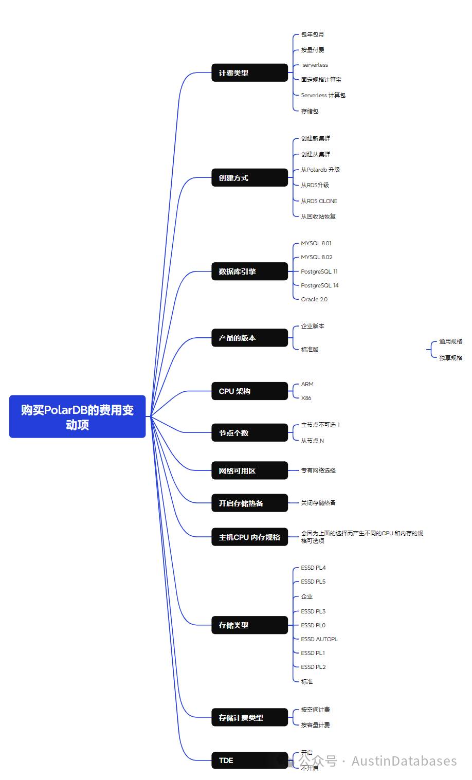 我总结了一个逻辑思维导图,这里仅仅是一个PolarDB 数据库可以选择和搭配的可选项,这一堆的可选项已经可以让你头脑风暴一阵子了,每一项都是费用的变动项,我这里通过不同的搭配组合,我可以得到