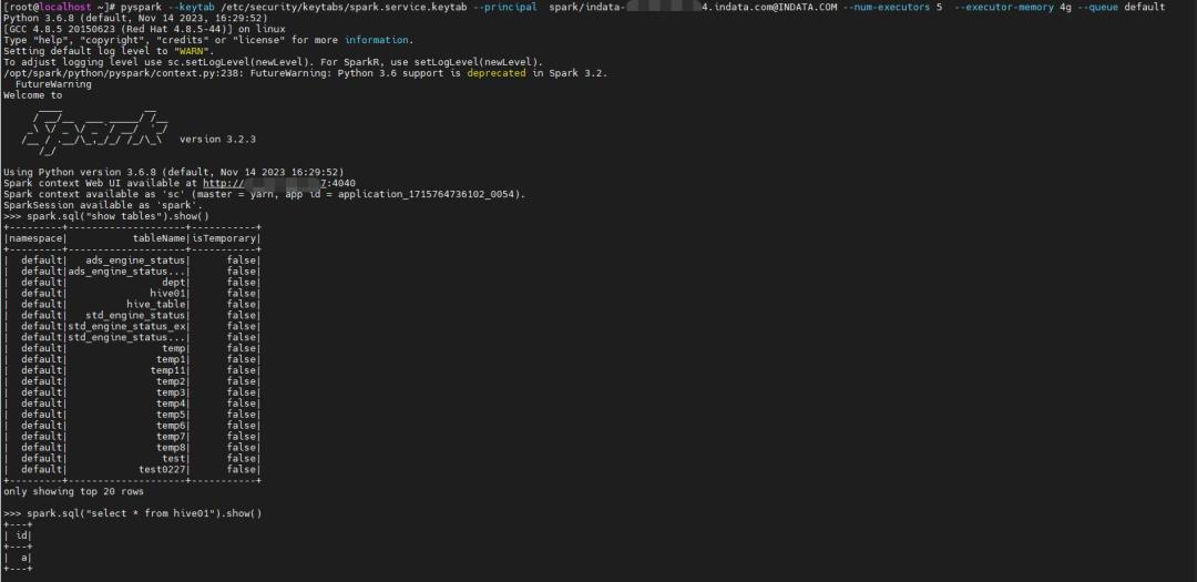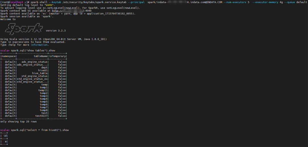 spark-shell --keytab /etc/security/keytabs/spark.service.keytab --principal spark/indata-192-168-44-154.indata.com@INDATA.COM --num-executors 5 --executor-memory 4g --queue default