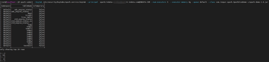 spark-submit --keytab /etc/security/keytabs/spark.service.keytab --principal spark/indata-192-168-44-154.indata.com@INDATA.COM --num-executors 5 --executor-memory 4g --queue default --class com.inspur.spark.SparkHiveDemo ~/spark-demo-1.0.jar