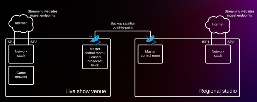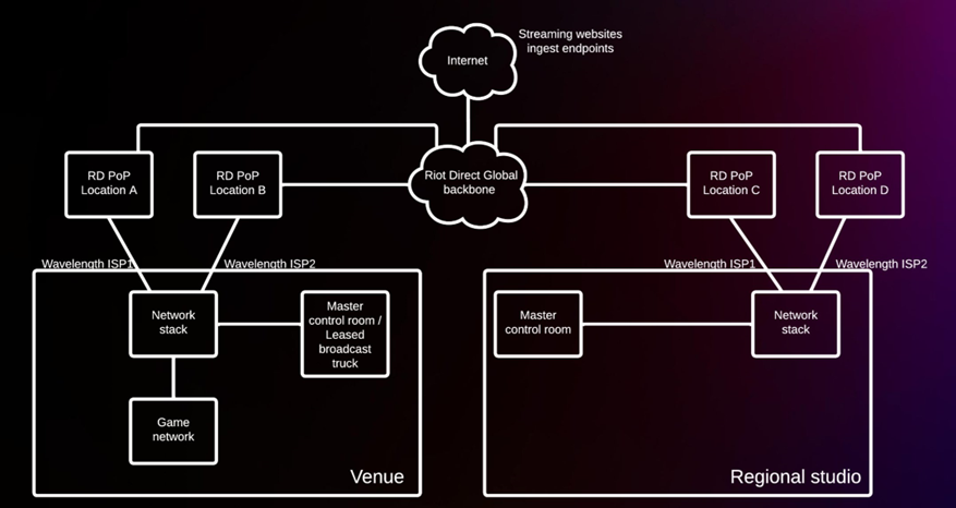 将直播现场和演播室的网络接入 Riot Direct backbone,解决了之前可能发生的网络故障的问题; 因为 Riot Direct backbone 是一个每天都在被玩家使用的网络链路,所以 Riot Direct 的质量是可观测可调度的,不需要再担心直播现场和演播室到网络直播平台之间的网络问题。