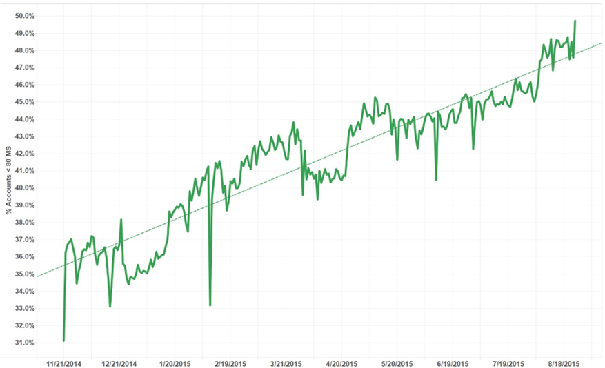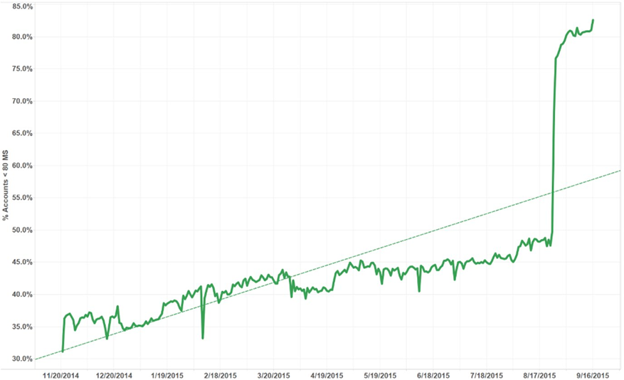 在 Riot Direct 上线之前,大约只有30%的玩家是在 80ms 以下的延迟进行游戏的。通过建立 Riot Direct 骨干网进行优化后,80ms 延迟以下的玩家达到了50%。虽然有了很大的提升,但是还远远不够,因为网络延迟的优化是无法突破光传输速度的限制。