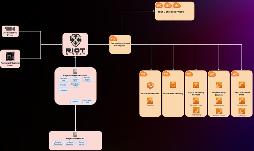 基于亚马逊云科技的强力支持,拳头游戏启动了 Project Stryker 项目,开始构建下一代的电竞直播基础设施。在 Project Stryker 设计之初,拳头游戏已计划将所有部署在数据中心的服务全部迁移到亚马逊云科技,包括:网络、计算、图像、视频编解码等;同时在云上构建新的服务,包括:给员工和主播使用的 Workspace、stryker 视频流服务、stryker 点播服务等等。