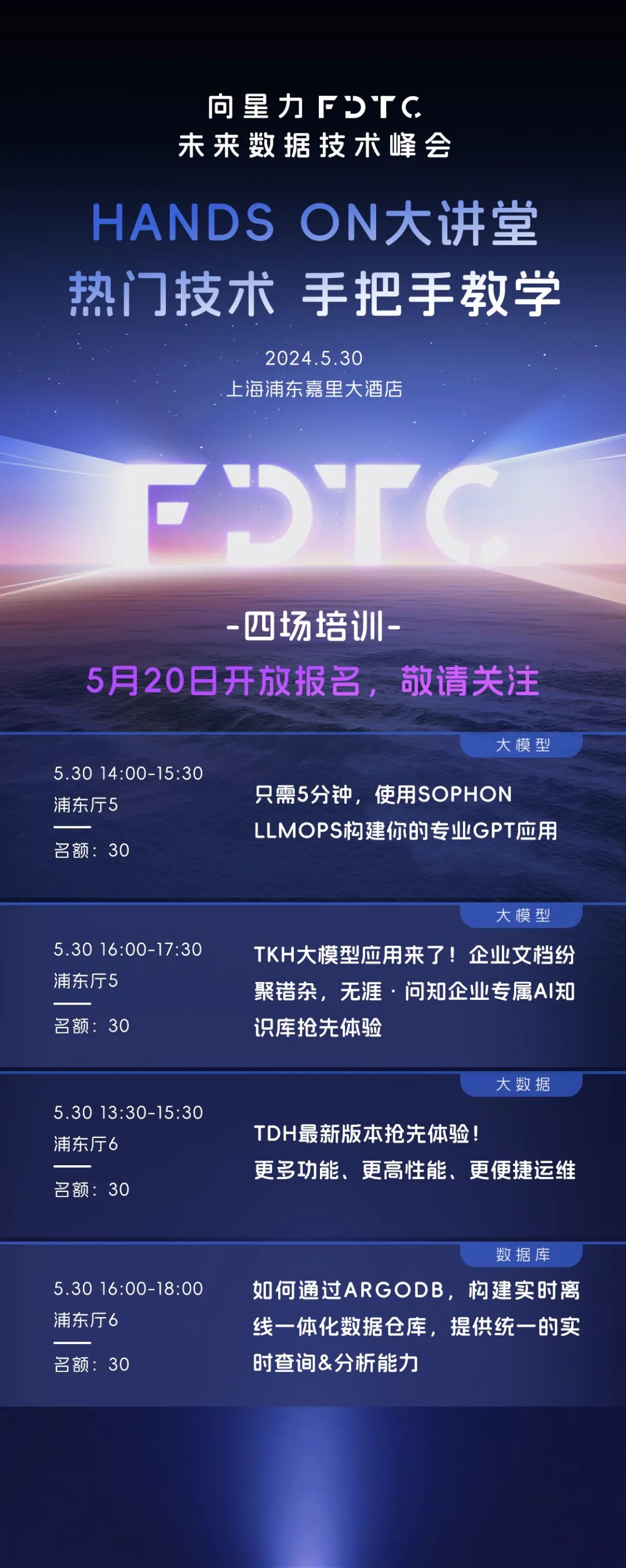 4场会前技术培训围绕大数据、大模型、数据库等热门技术动手实践,将在5月30日下午举行。