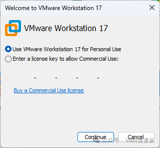 注意:只有这两个最新版本以及以后的版本才支持个人使用 (Personal Use) 免费许可。以 Workstation Pro 为例,在第一次启动时会要求你输入 license key,对于个人用户而言,你只需要选 Personal Use 就可以免费使用了。