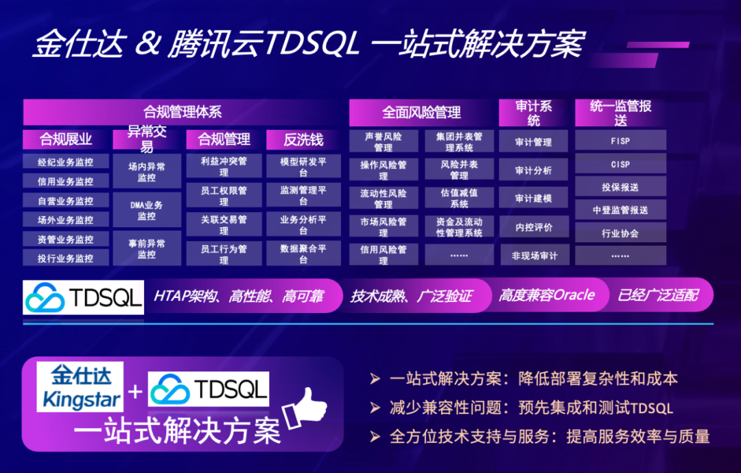 。第一,金融机构可一次性获得包括数据库在内的全套软件解决方案,简化采购流程,减少整合不同供应商产品的复杂性和成本。第二,方案预先集成和测试TDSQL,确保其与金仕达软件的兼容性,减少实施过程中遇到的技术障碍。第三,可以直接从金仕达获得包括数据库在内的全方位技术支持和服务,简化沟通渠道,提高金融自主创新效率。