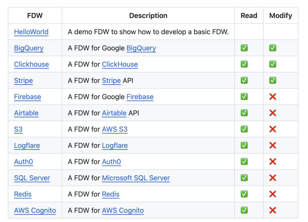 这意味着,你现在可以用 PostgreSQL 读写 BigQuery, ClickHouse, 以及支付服务 Stripe 数据了。Firebase,Airtable,S3,Logflare,Auth0,SQL Server,Redis,Cognito 也提供了通过 PostgreSQL ,使用 SQL 读取的能力。