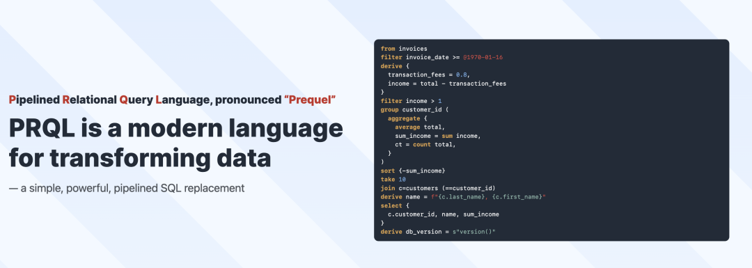 plprql 扩展,提供了一种类似于 SQL 的全新数据库查询语言 PRQL: