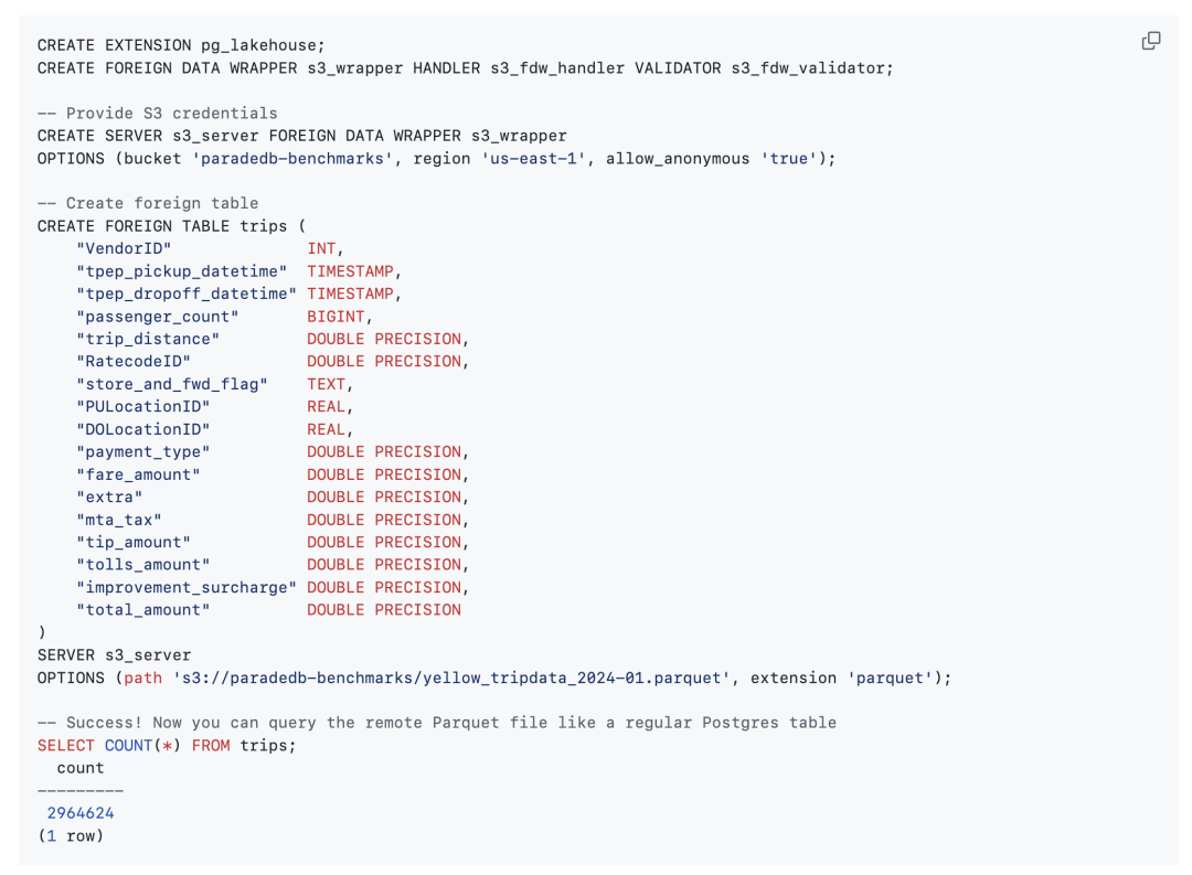 如果您觉得仅仅是 Parquet 太不过瘾,那么由 ParadeDB 提供的 pg_lakehouse,则把这件事拔高到了一个新高度 —— 你现在可以直接将PG作为湖仓使用,读取 S3 MinIO 本地文件系统上的 Parquet,CSV,JSON,Avro,DeltaLake,以及 后续的 ORC 格式文件,用于湖仓数据分析!