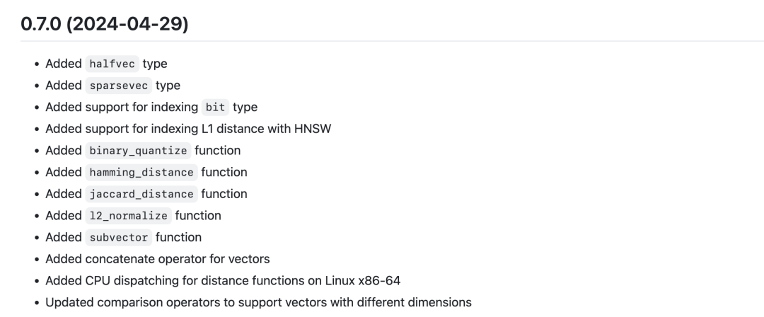 在 AI 人工智能方向上,pgvector 0.7 引入了重大的升级,现在支持稀疏向量(让 pg_sparse 原地退役了!),支持 half float 量化,向量最大维度翻倍到了 4000 维,添加了 binary 量化模式(维度可达 64K ),添加了两种新的距离度量与相应的索引。最重要的是,现在还支持用 SIMD 指令了,性能相比一年前有了翻天覆地的改善!
