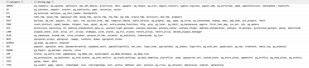 因此,在 Pigsty v2.7 版本中,我们重新审视了整个 PostgreSQL 生态的所有扩展插件,将其中一些佼佼者收录其中,我们新收录的扩展如下: