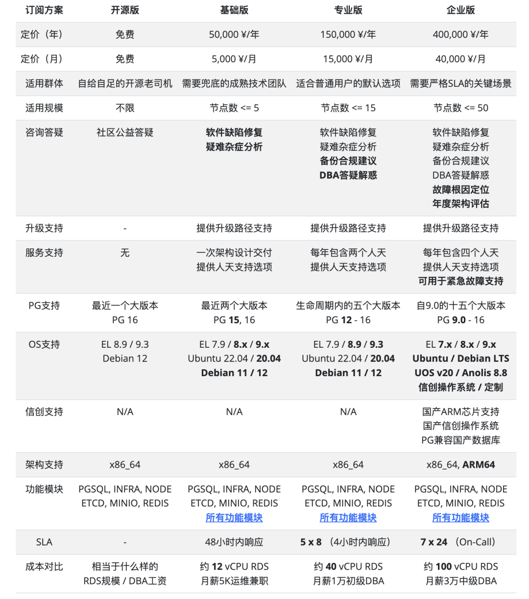 Pigsty 专业版与开源的区别主要在于兼容性与功能模块,例如 PostgreSQL 大版本支持范围,操作系统大版本支持范围,芯片架构支持范围。