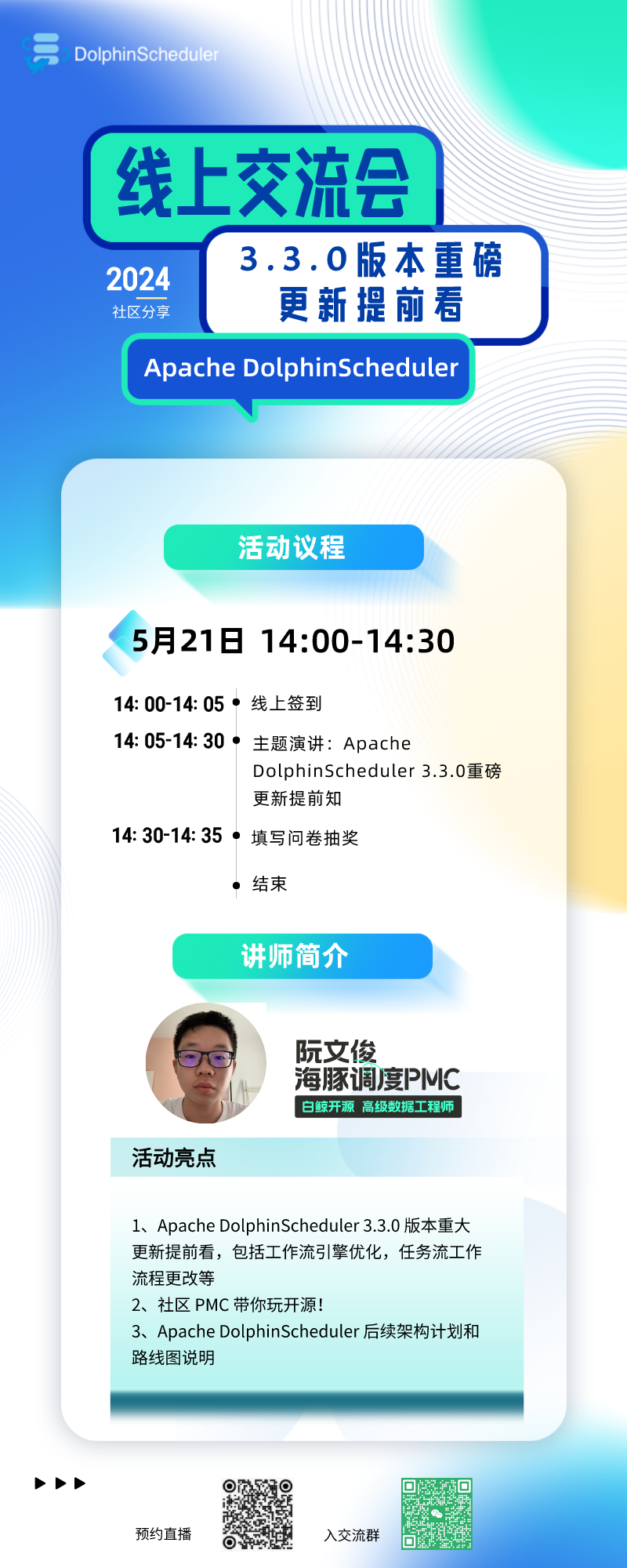 活动时间:2024年5月21日 下午2-2:30 活动形式:线上直播 活动主题:Apache DolphinScheduler 3.3.0版本发布预告