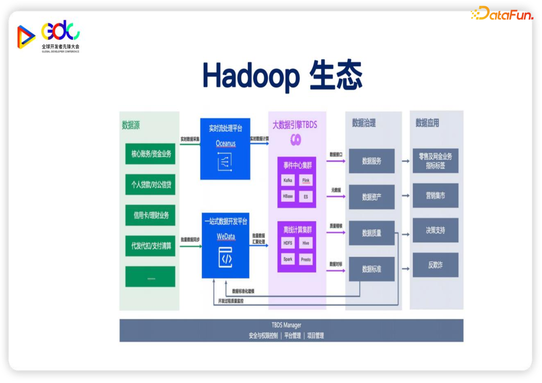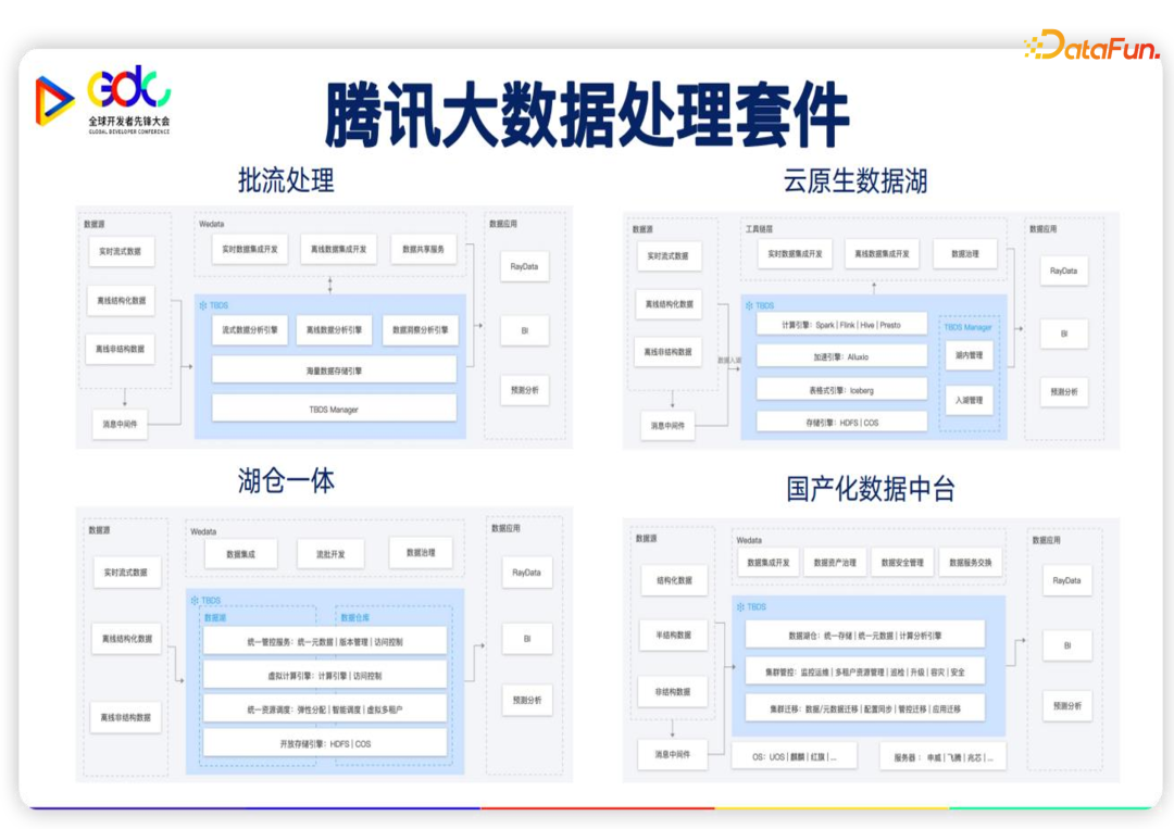TBDS的全称是腾讯大数据处理套件,它是一个基于 Hadoop 生态以及 MPP 生态的大数据平台。我们主要有以下的四种应用场景:大数据的批流的处理,云原生的数据湖,湖仓一体,以及国产化的数据中台。