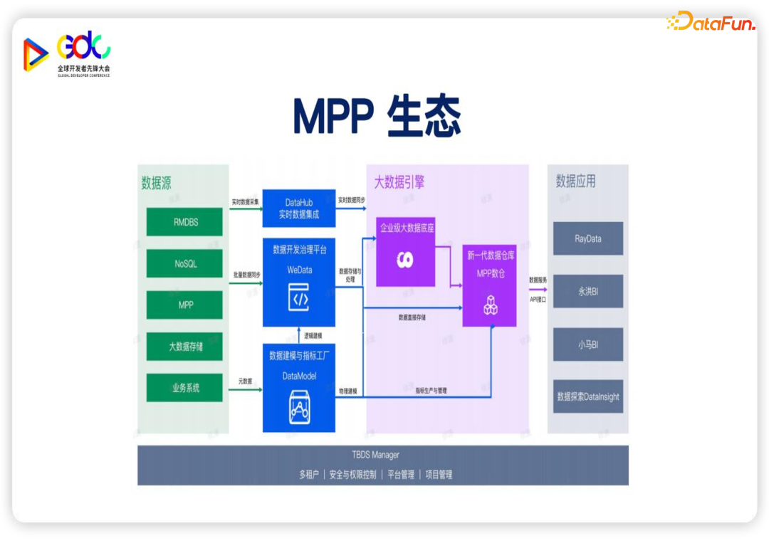 整个大数据平台是基于 Hadoop生态搭建的;得益于 Hadoop生态的繁荣,基本上每种特定的需求都可以找到合适的计算存储组件来满足。除了 Hadoop,我们还提供基于 MPP的技术方案,它对于中小体量的客户更加合适。基于 MPP的来搭建数据平台,实时链路以及离线链路的数据都进入 MPP,然后来统一加工处理,最后也是由 MPP统一对外提供数据服务。