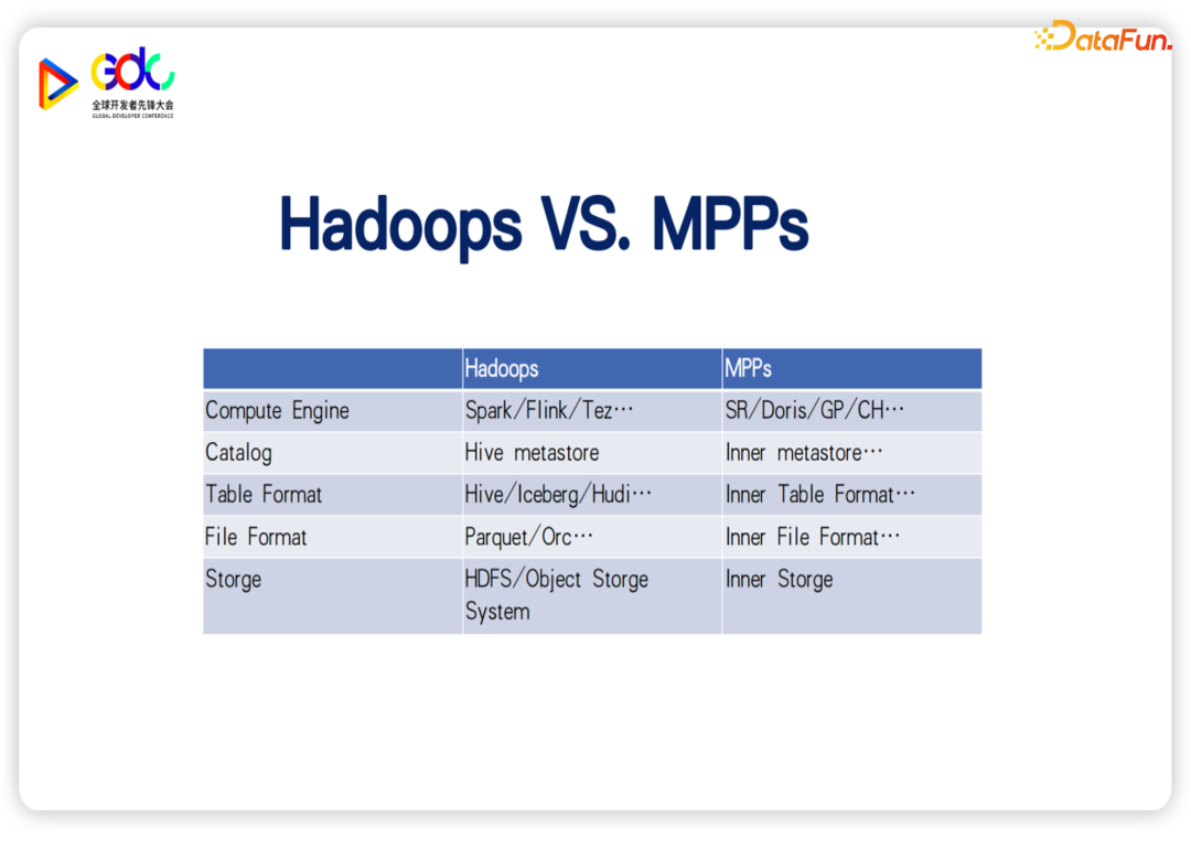 Hadoop还是 MPP?这两个生态之间的对比,其实业界已经讨论非常多了。随着各自的发展,我相信相关的讨论也会一直持续下去。例如对 Iceberg这样的数据湖表格式的支持,目前无论是 Spark还是 ClickHouse,都在做军备竞赛,现在的结论过两三个月可能就过时了。