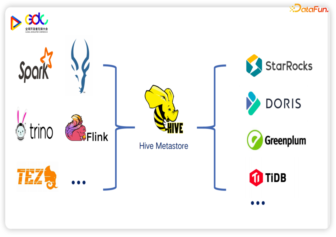 目前其实已经有一个可以跑通的技术方案,就是利用 Hive Metastore 作为统一的元数据中心。在图的右边是 MPP 的服务,在使用外表的模式下,它们可以使用 Hive Metastore 作为数据来源。左边是 Hadoop 生态下的计算引擎,它们基本上都会默认使用 Hive Metastore 作为它们的元数据服务。在这样一个统一的元数据服务的情况下,再加上支持如 Iceberg 这样的表格式,提供统一的元数据的格式,基本上问题可以得到解决。这也是目前很多私有化场景下湖仓一体、湖上建仓的技术基础。在上面的方案中,Hive Metastore 是绝对的核心,然而 Hive Metastore 本身还是有很多的局限性的。首先 Hive Metastore 是一个单纯的元数据技术和服务,基本上没有任何的治理能力。其次它的元数据模型完全是关系型的数据库模型,对于像 Message、Topic、文件,以及 AI 模型这类半结构化、非结构化的数据基本是不匹配的。而且它的服务设计也没有考虑到要承担如此重要的任务,所以有很明显的单点瓶颈。