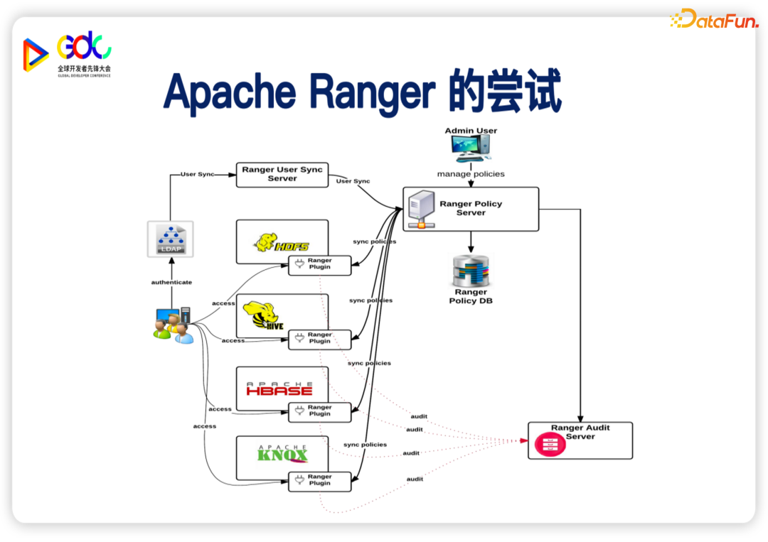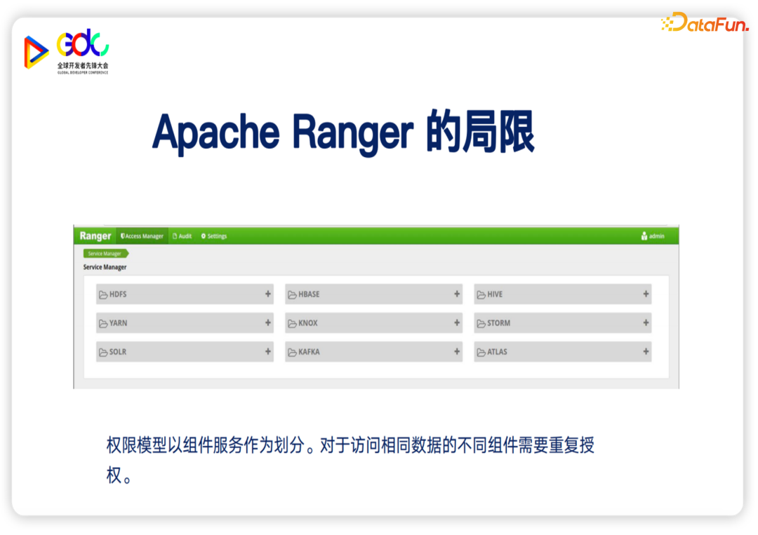 因此,如果没有一个统一的权限中心,单个资源的授权就需要在每一个子系统上面再重复地授权一遍,步骤非常繁琐,并且很容易出错。在 Hadoop生态下,Ranger是一个权限中心,它的机制是有点像 OPA (open policy agent),整个权限策略被 Manager统一的管理,然后各个计算引擎使用各自的 Plugin 进行授权。但是它的权限模型存在一定的问题。最重要的问题是它顶层设计的概念并不是以数据来划分的,而是以服务组件来划分的,不同的组件,如果要访问同样的数据,那么需要重复的授权,而且这只是当前 Hadoop生态的一个方案,MPP生态基本是没有权限管理。