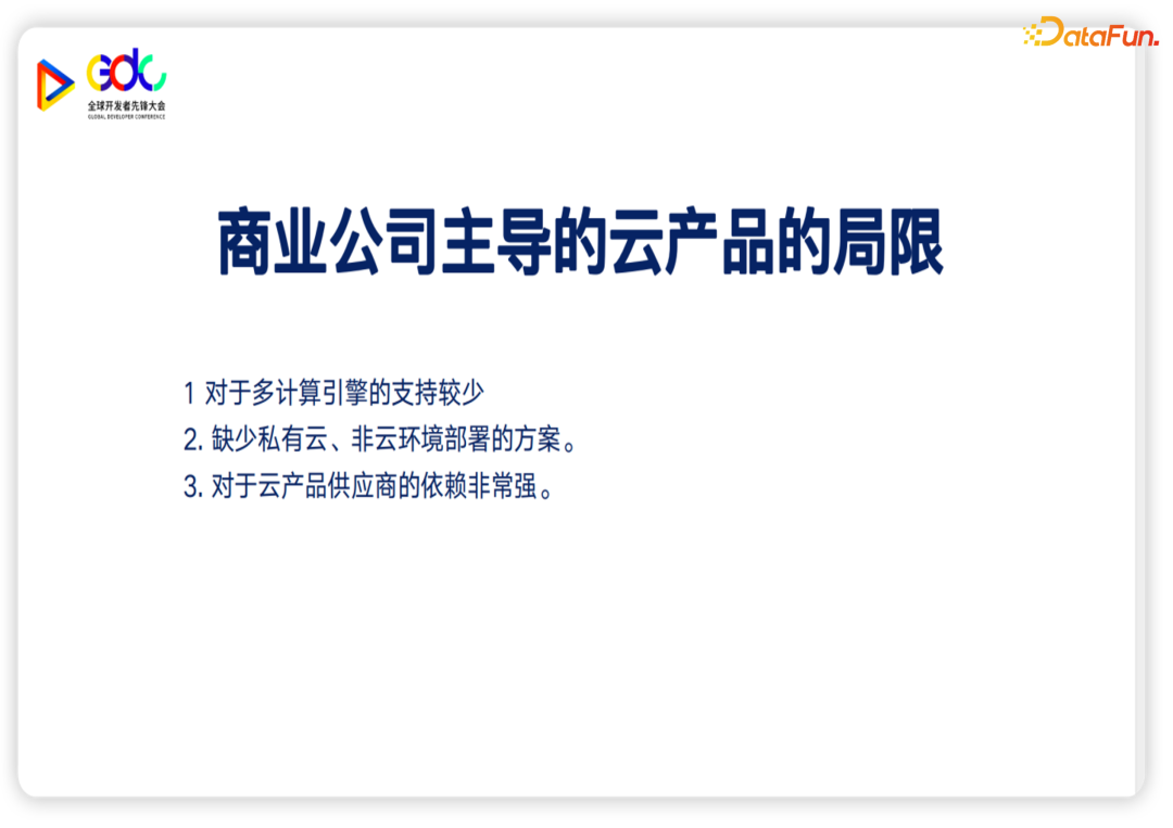 首先是对于计算引擎的支持比较少,也缺少私有云、尤其是非云化环境的部署方案。并且它们对于云厂商本身的依赖程度非常深。
