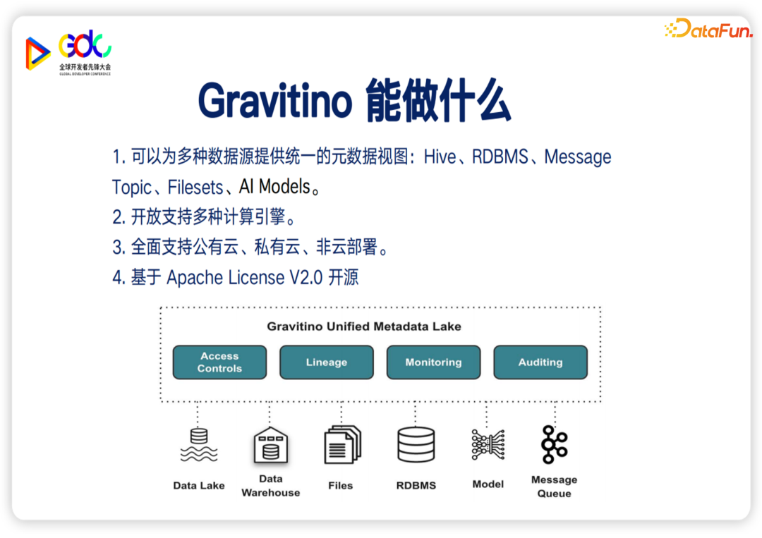 我来简单的介绍一下 Gravitino,它是一个使用 Apache License v2.0许可证的开源统一元数据服务,全面支持公有云、私有云以及非云环境的部署。它可以为多种的数据源提供统一的元数据视图,并且提供了标准的 SDK,可以开放的支持多种计算引擎的接入。