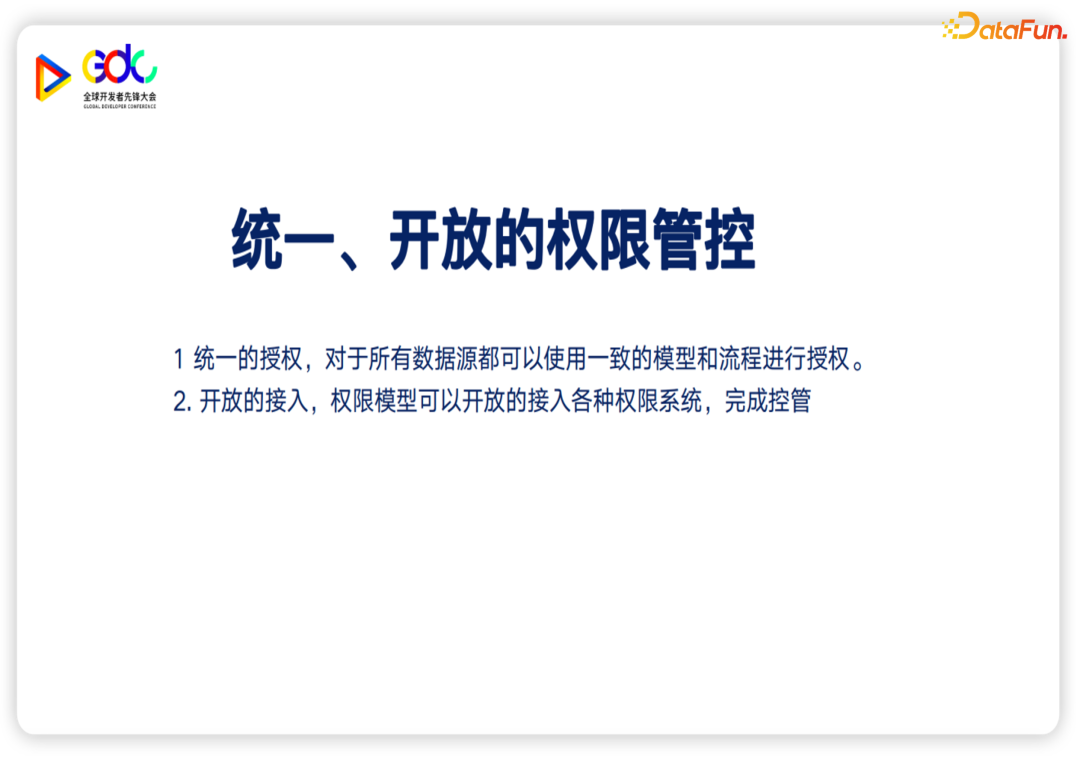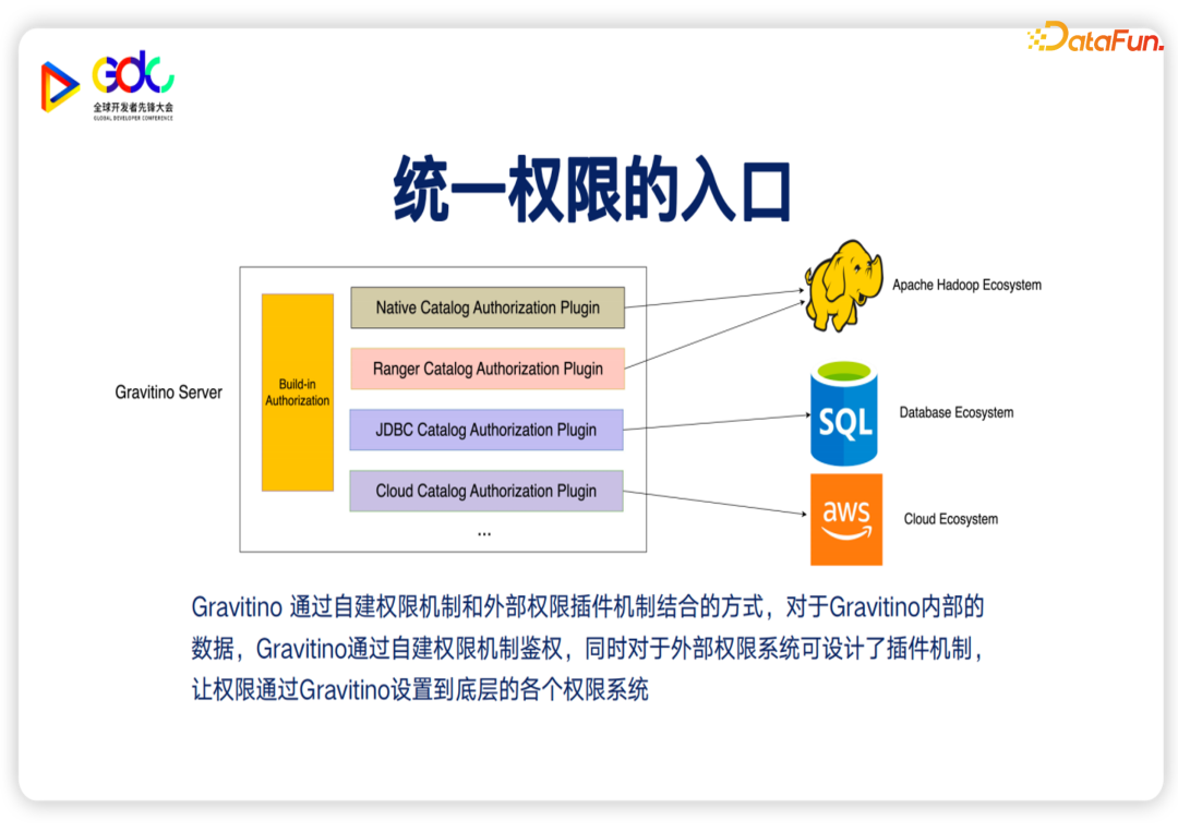 此外很重要的一点是,Gravitino提供了一个统一的、开放的权限管控机制。统一指的是统一的授权:对于所有的数据源,可以使用统一的模型和流程来进行授权;开放指的是开放的接入:对于数据源可以使对于各种计算引擎包括 MPP,以及存储,都能接入这样的权限模型,完成权限的管控。