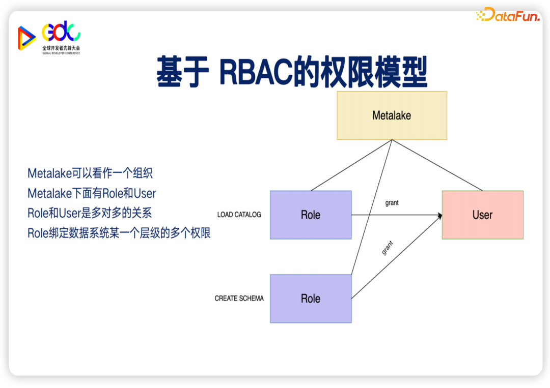 首先我介绍一下权限模型,业界比较常见的权限模型有 ABAC、RBAC等等,但是目前还是以 RBAC为主。Gravitino在这块儿也是采用了 RBAC的权限模型。首先我们可以看出这张图里有几个概念,第一个概念就是 Metalake。第二个是 Role,第三个是 User。对于 Metalake 来说,我们可以把它看作是一个组织;一般来说,一个企业就是一个 Metalake,它只有一个组织。在 Metalkae 下面会挂载 Role 以及 User。Role主要是我们权限模型中用来管理权限的核心概念,它会绑定具体的一些权限。Role是实体的具体的某些权限的集合。在实际的使用的过程中会把 Role授权给 User,Role和 User是多对多的关系,可以去进行比较灵活的绑定。讲完了权限模型,我介绍一下统一权限的系统架构。Gravitino的权限大概可以分为两部分:第一部分是,它对于自身会有内建的鉴权,主要负责对于自身管理的一部分的元数据进行鉴权,比如说 Metalake 的一些鉴权,比如说自有的一些数据实体的鉴权。同时它还提供了强大的插件机制,用来对接一些外部系统的权限。