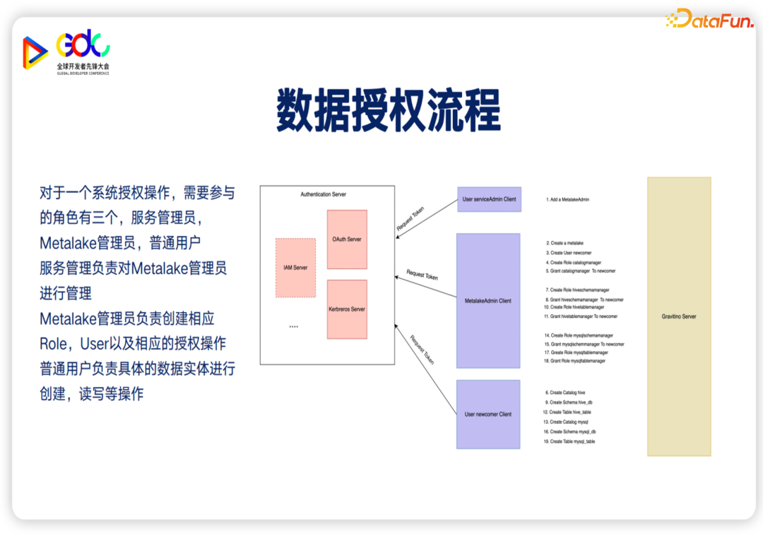 可以看到,左边是认证 Server,会支持三种认证服务。第一种是 OAuth的认证,第二种是 Kerberos认证,Kerberos认证在大数据的生态用得会比较多一点;第三种是 IAM 认证,对于云的系统 IAM会使用得比较多。整体会提供对用户的认证,然后是数据授权的过程。Gravitino 在参与的过程中会有三个角色:第一个角色是Service Admin,它的职责其实比较简单,就是创建 Metalake;第二个角色是 MetalakeAdmin,主要对 Metalake下面的 Role的创建和管理,以及对各种权限的 Role的创建,并把这些 Role和具体的 User进行绑定。第三个角色是普通 User,他可能是新加入的 User,负责具体的数据实体的创建,例如创建 Catalog、数据库、表,然后读取这些表。在这个过程中,我们可以简单来看一下简单的创建 Catalog和之后创建表的过程。第一步是 Service Admin会去创建 Metalake,之后 Metalake admin会去创建 Role,然后创建需要具体使用的 User,然后去创建 Catalog,然后开通了Catalog的 Manager Role,去把 Catalog Manager Role赋予给 new user。New user就可以具体创建 Catalog,例如可以创建 Hive Catalog,创建 MySQL Catalog。这个时候 Metalake admin可以去创建 Hive的 Schema Manager,把Schema Manager授予给 new user,然后 new user就可以创建 Schema。之后 Metalake admin可以创建Hive Table的 Manager role,再把 Hive Table的 Manager role授予给 new user,就可以具体去去创建 Hive Table。对于 MySQL也是同样的,会去创建Catalog、Table。当 Hive catalog 以及 MySQLCatalog和 HiveTable都创建完之后,具体的 new user就可以读取这两个表。最后介绍一下 Gravitino