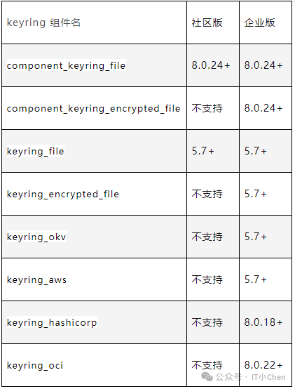 对于不同的版本,支持的文件加密也是有区别的,8.0.23或以上,支持的加密包括有:独立表空间、通用表空间、DoubleWrite文件、mysql系统表空间、Redo log和UndoLog文件的加密。