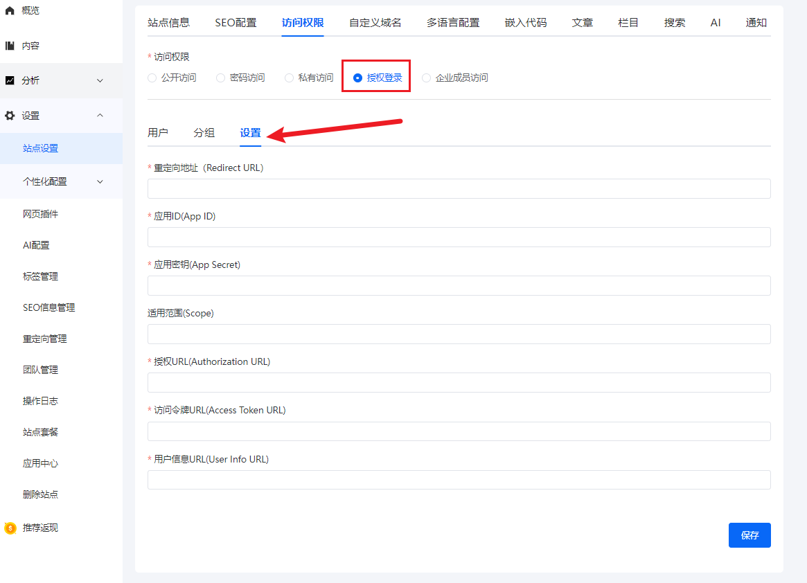 在“设置” → “站点设置” → “访问权限”,选择“授权登录”,点击“设置”,填写配置信息: